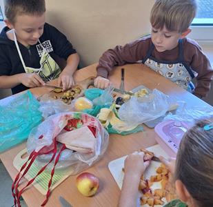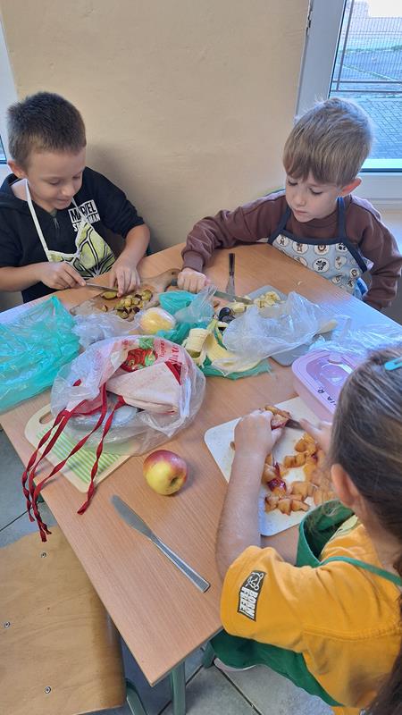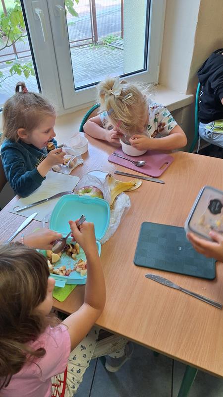W ostatnich dniach w naszym przedszkolu rozmawialiśmy o zdrowym odżywianiu. Dzieci dowiedziały się, dlaczego warto jeść owoce i warzywa każdego dnia. Wspólnie przygotowaliśmy pyszną sałatkę owocową, a z okazji Dnia Jabłka nie zabrakło także smakołyków – dzieci próbowały szarlotki z lodami oraz obserwowały, jak powstaje naturalny sok z jabłek podczas ich wyciskania. Była to nie tylko wspaniała zabawa, ale również cenna lekcja o zdrowym stylu życia.